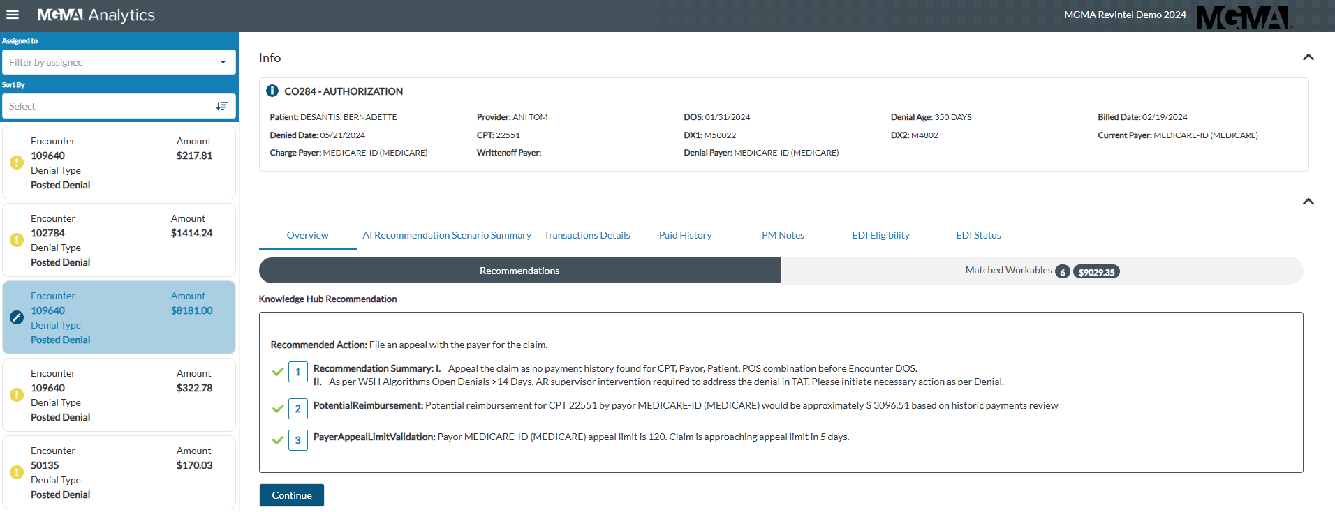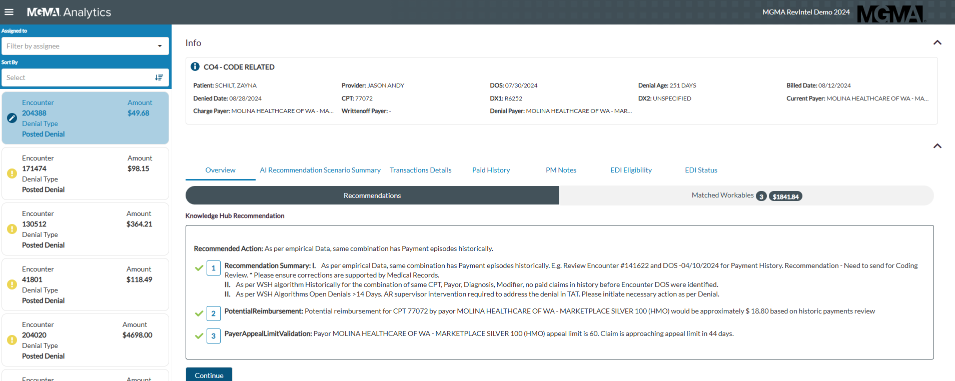 Utilize the Resolution Center in your MGMA Analytics platform to receive custom machine learning recommendations based on specific filters, denial types, claims and more.