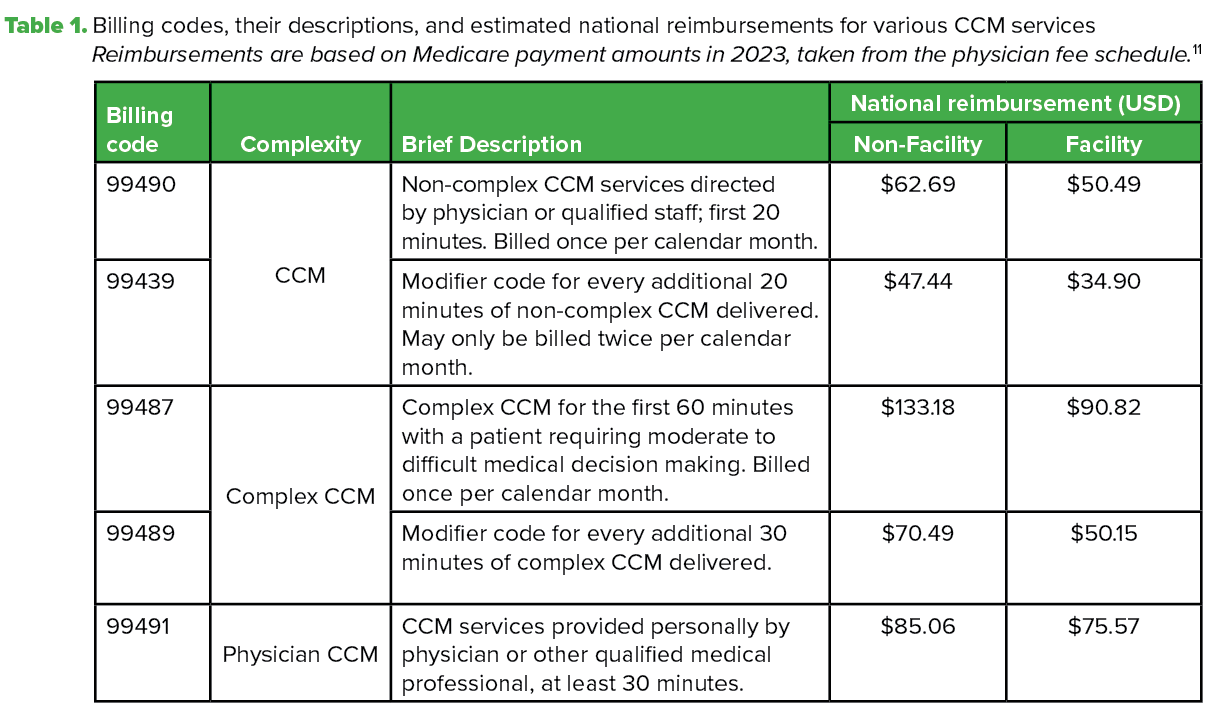 The CCM program began in 2015 with a set of reimbursement codes so that hospital systems and/or providers may bill for time spent beyond the clinic managing patients with complex conditions.1 This time is often spent outside the clinic, and includes monthly calls with patients in which the providers discuss patient needs, medication use and adherence, preventative services and more.
