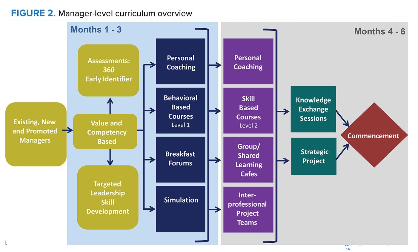 For senior-level leaders with high potential, the curriculum model can be extended to a two-year program (Figure 3). This approach “is a little more intensive from a time commitment and assessment commitment,” Aloi said, but it typically is more exclusive, with participants nominated by the executive team and medical staff leadership.