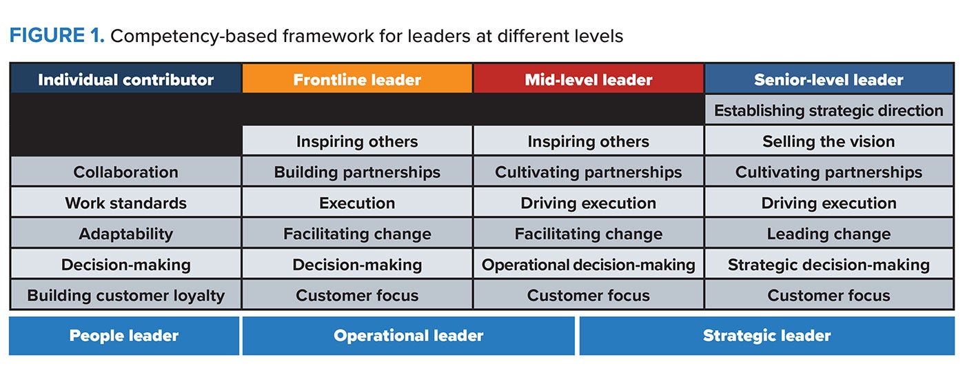 The sample competency-based framework that Aloi shared (Figure 1) distinguishes competencies needed for people leaders, operational leaders and strategic leaders at different levels of the organization. “All leaders need a customer focus. … Driving execution is also going to be extremely important for leaders, but maybe not so much as the individual contributors,” Aloi said.