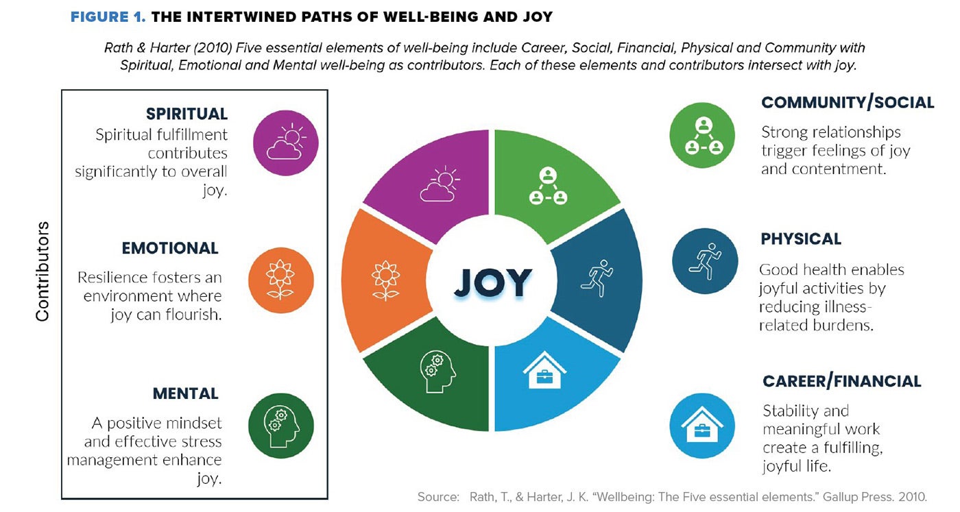 Prioritizing joy includes pursuing the intersection of well-being and joy as linked but distinct efforts, resulting in favorable employee and organizational outcomes. Well-being is a significant driver of joy, acting as both a foundation and a catalyst for experiencing this positive emotion. Figure 1 visualizes how well-being intersects with joy.12