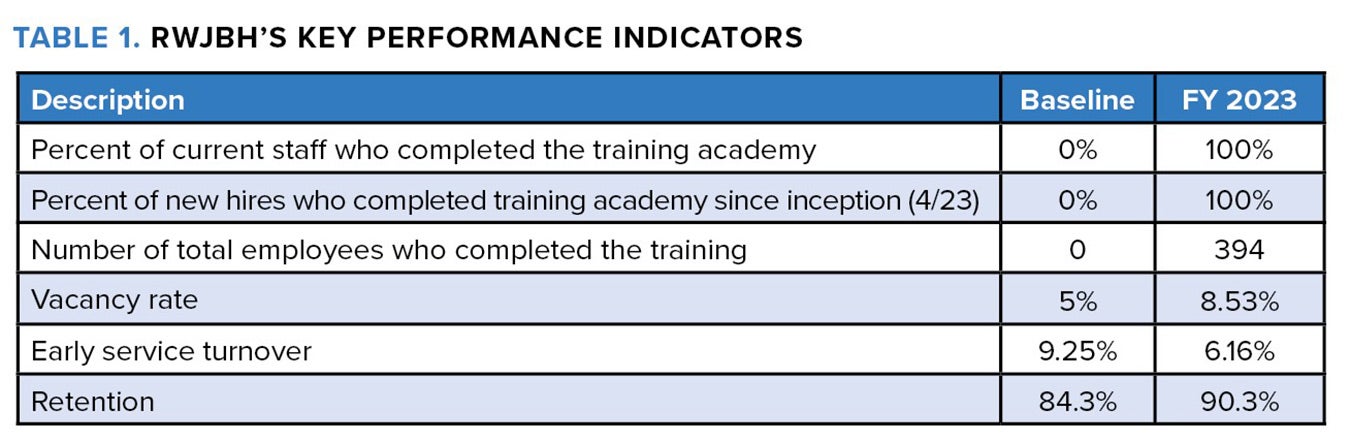 The strategic goals for the medical group include expanded access, improved integration, becoming a center of excellence and enhanced recruitment/retention. RWJBH had average performance in these areas but wanted to improve the productivity of providers and staff, excel at customer service and reduce vacancy rate and staff turnover while improving employee retention. RWJBH Medical Group leadership assigned a team to meet these strategic goals. The team implemented a plan to retain staff through onboarding and training academies.