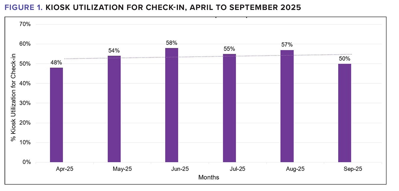 Self-service kiosk utilization is encouraging and trended upwards. In the initial months of roll-out we understood the importance of having navigators at the kiosk as a method of improving patient engagement with the device. One of the practices experienced an operational emergency reflected in the dip in kiosk utilization in September 2025. But for the kiosks, the impact on operations would have been significant. (See Figure 1.)