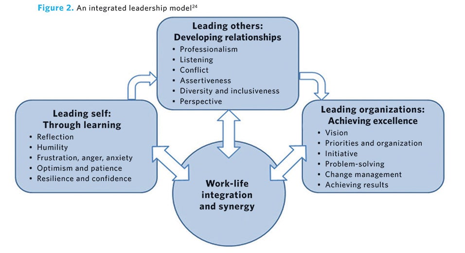 - Evaluating and optimizing leadership strategies to lead through learning, lead others through developing relationships, lead organizations by achieving excellence with a focus on work-life integration and synergy (Figure 2), an integrated leadership approach. Each identified strategy, using the succession and talent management toolboxes and functions,25 may be considered for future development opportunities [onboarding, DEI practices, self-assessments, 360-degree feedback, leadership development plans, performance management, coaching, mentoring, stretch assignments, etc.].
