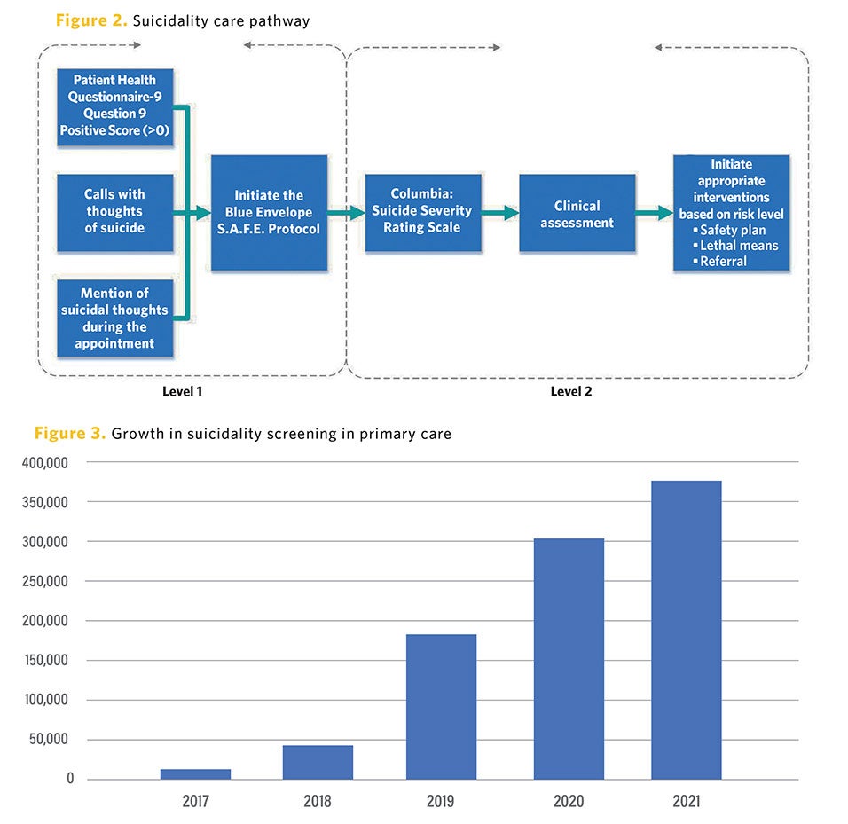 The journey to proactively screen for suicide risk in primary care included many questions regarding the additional time needed to appropriately care for patients who screen positive. Much time and effort were dedicated to attaining buy-in and investment to place behavioral health specialists (BHSs) within primary care practices. These BHSs — clinical master level social workers (LMSWs) — provide care coordination and short-term psychotherapy to the patients associated with the office. These positions are critical to help primary care providers navigate suicidality assessments, treatment plans and transitions of care while ensuring that delays for other scheduled patients are minimized. Any patients requiring more long-term psychotherapy or psychiatry are appropriately referred for services. Investments to augment these services was secured to ensure demands could be met. Patients who are assessed at low risk are often treated within the primary care setting through lethal means reduction, safety planning, patient education and continued follow up.