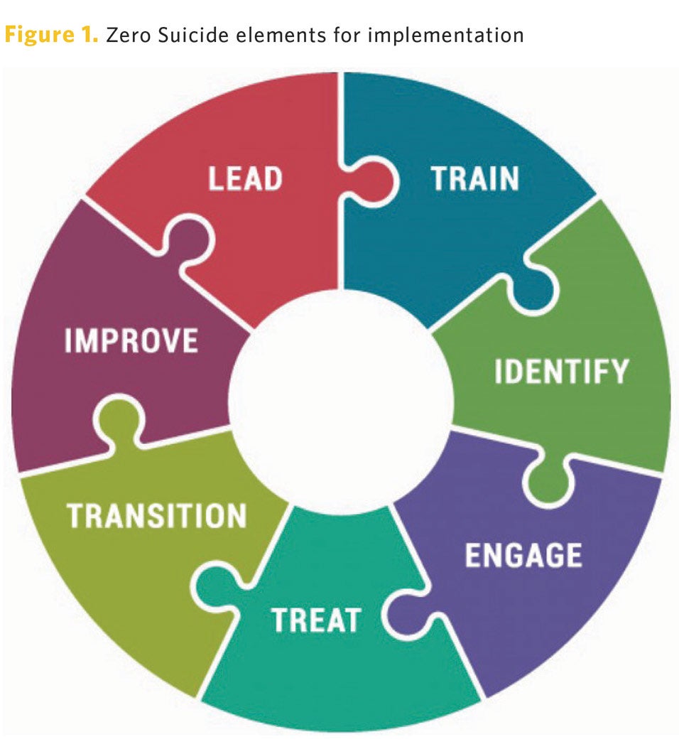 The Zero Suicide framework contains seven core elements (Figure 1) to provide safe care for individuals with suicidal thoughts and urges. These elements represent a holistic approach to suicide prevention applicable to health and behavioral health care systems.7