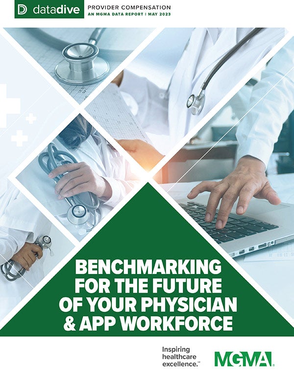 In our new data summary report, Benchmarking for the Future of Your Physician and APP Workforce, key trends and benchmarks from MGMA DataDive are examined through the lines of recent MGMA Stat polling and research, as well as expert insights from leading consultants to give an up-to-date and comprehensive picture of the compensation landscape, with metrics to help healthcare leaders budget and build compensation models that will recruit and retain the physicians and APPs of the future.