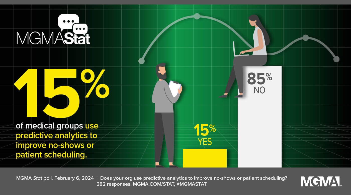 A Feb. 5, 2024, MGMA Stat poll found that 15% of medical groups use predictive analytics to improve no-shows or patient scheduling, compared to 85% that do not. The poll had 382 applicable responses.