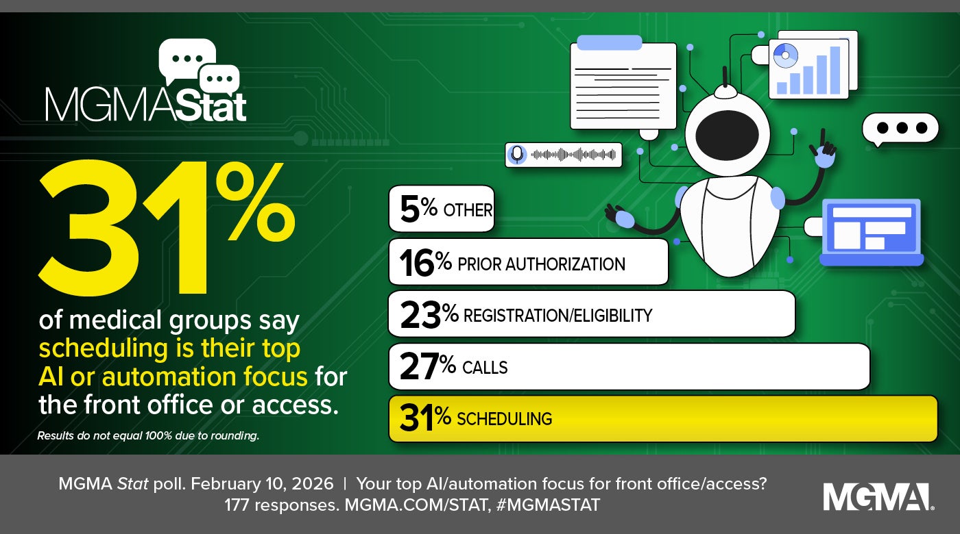 Our Feb. 10, 2026, MGMA Stat poll gives a sense where your peers in other practices are circling back to AI and automation to improve access with cost-effective strategies. Atop the list was scheduling (31%), followed by calls (27%), registration/eligibility (23%), prior authorization (16%), and “other” (5%). The poll had 177 applicable responses. [Editor's note: The figures do not total 100% due to rounding.]