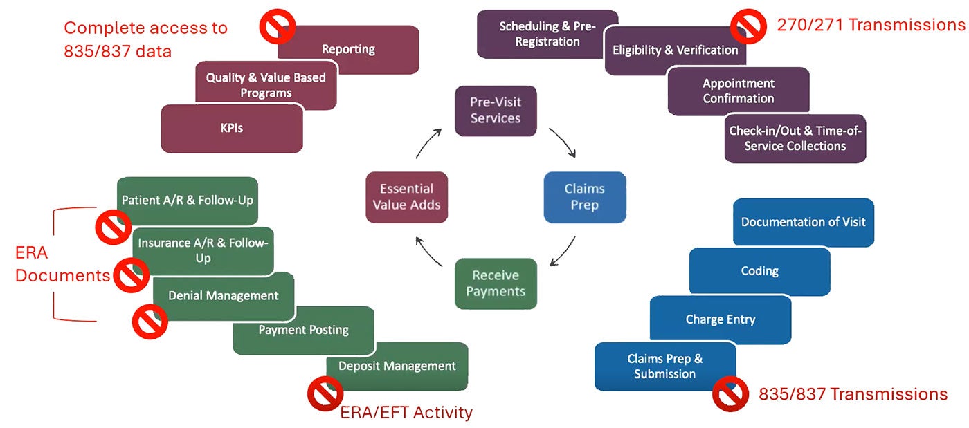 To understand how impactful the outages from the Change Healthcare cyberattack were, it’s important to start with a comprehension of a clearinghouse interface flow, as illustrated in Tolliver and Gordon’s book, Revenue Cycle Management: Don’t Get Lose in the Financial Maze: