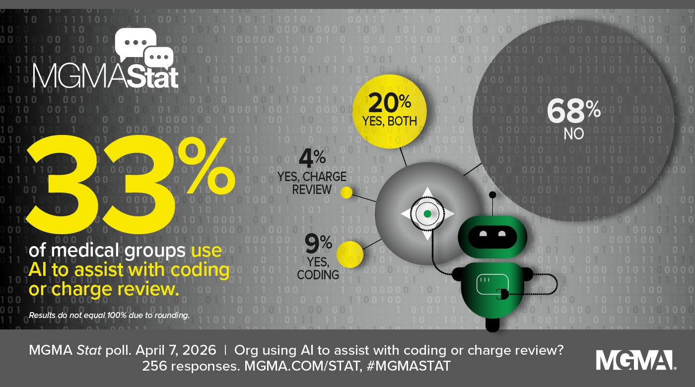 Our April 7, 2026, MGMA Stat poll found that only 33% of practice leaders say they are using AI for coding (9%), charge review (4%), or both (20%), while 68% are not. The poll had 256 applicable responses.