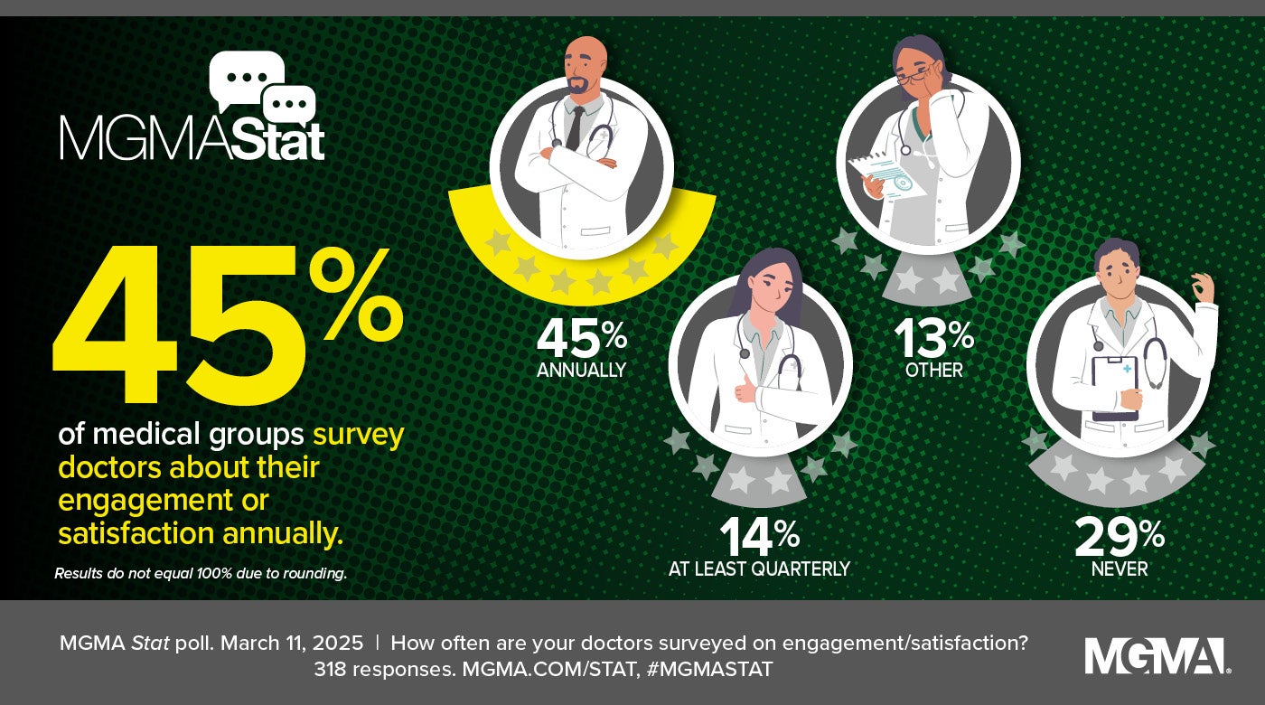 A March 11, 2025, MGMA Stat poll found that almost half (45%) of practice leaders survey their physicians annually on job satisfaction or engagement, while 14% do so at least quarterly, 29% said they never do, and 13% responded “other.” Among those responding “other,” the most common responses were conducting surveys every other year or twice a year. The poll had 318 applicable responses.
