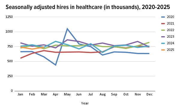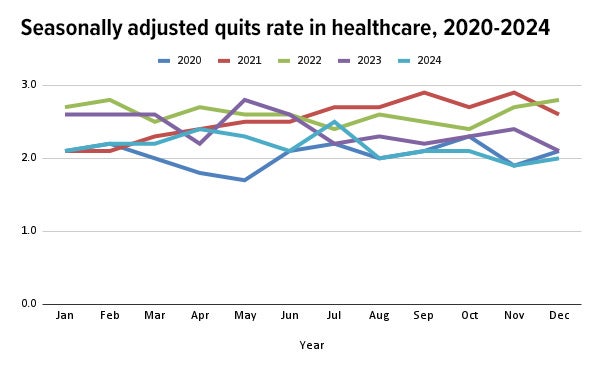 Seasonally adjusted data from the Bureau of Labor Statistics (BLS) reveal that the average quits rate — employees voluntarily leaving their jobs — in the healthcare sector dropped to 2.2% in 2024. This marks the lowest since the 2018-2020 average of 2.0%). The first months of 2025 are holding steady at that 2.0% level.