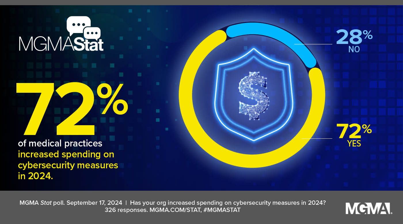 The growing financial and operational risk of cyber threats in 2024 has prompted many medical practices to reassess their cybersecurity strategies. A Sept. 17, 2024, MGMA Stat poll found that more than seven in 10 (72%) medical group practices increased their spending on cybersecurity measures in 2024, while 28% did not. The poll had 326 applicable responses.