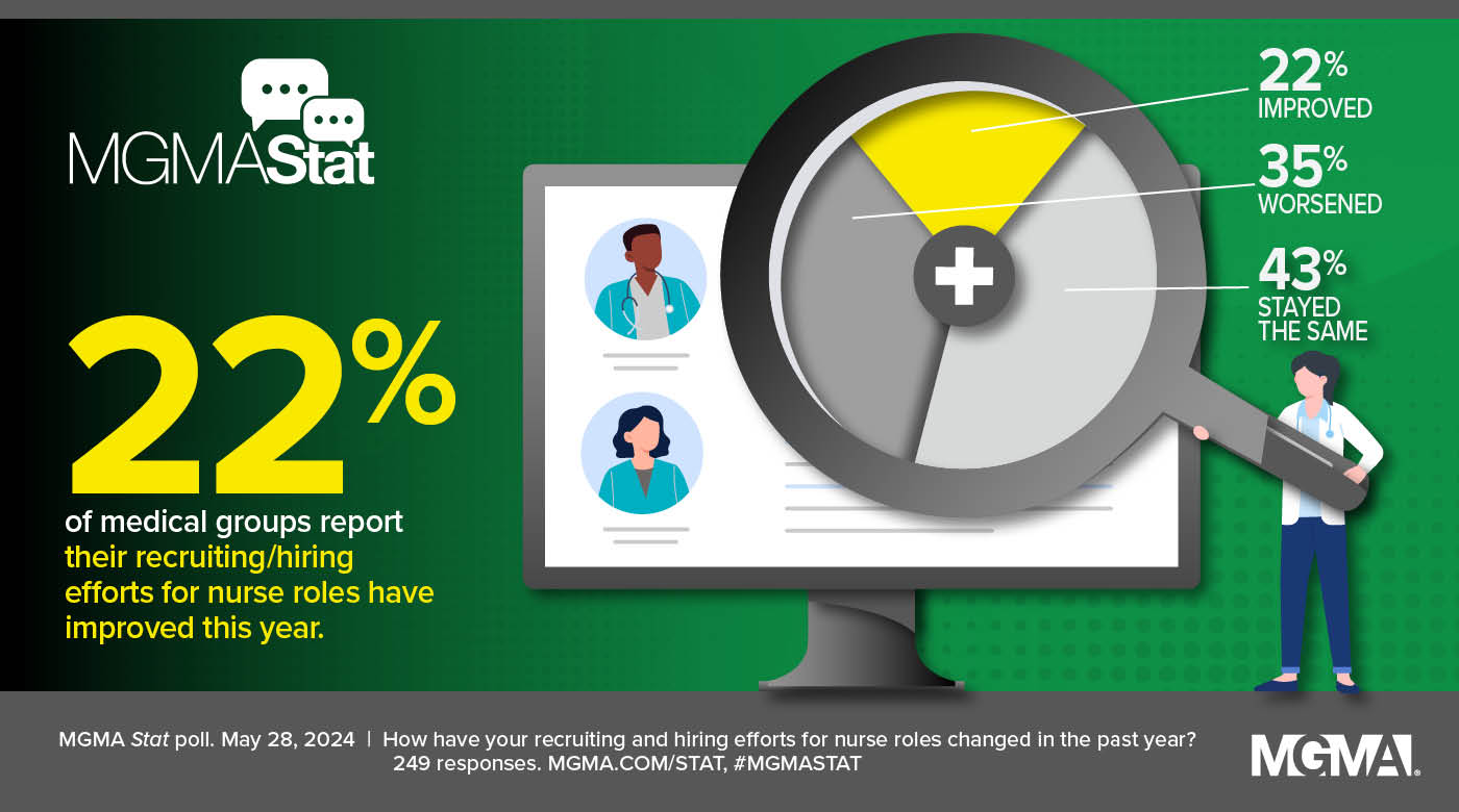 A May 28, 2024, MGMA Stat poll finds that 22% of medical group leaders say their nurse recruitment and hiring efforts improved in the past year, while the majority (78%) say they have seen little change (43%) or experienced worsened conditions (35%).  The poll had 249 applicable responses.