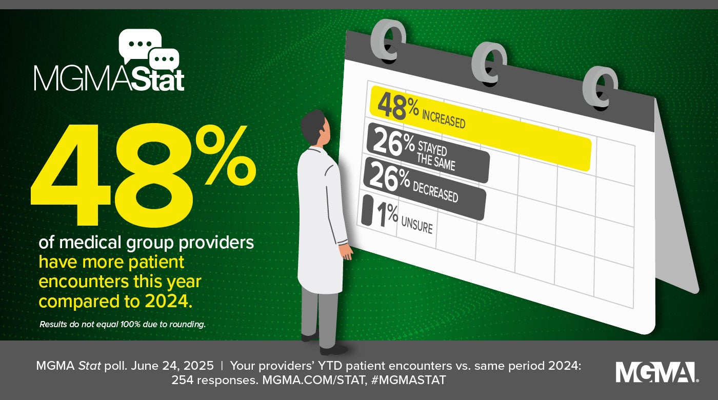According to a June 24, 2025, MGMA Stat poll, 48% of medical groups reported an increase in their providers’ patient encounters year to date compared to 2024. Another 26% said volumes remained about the same, while 26% noted a decrease. An additional 1% were unsure. The poll had 254 applicable responses.