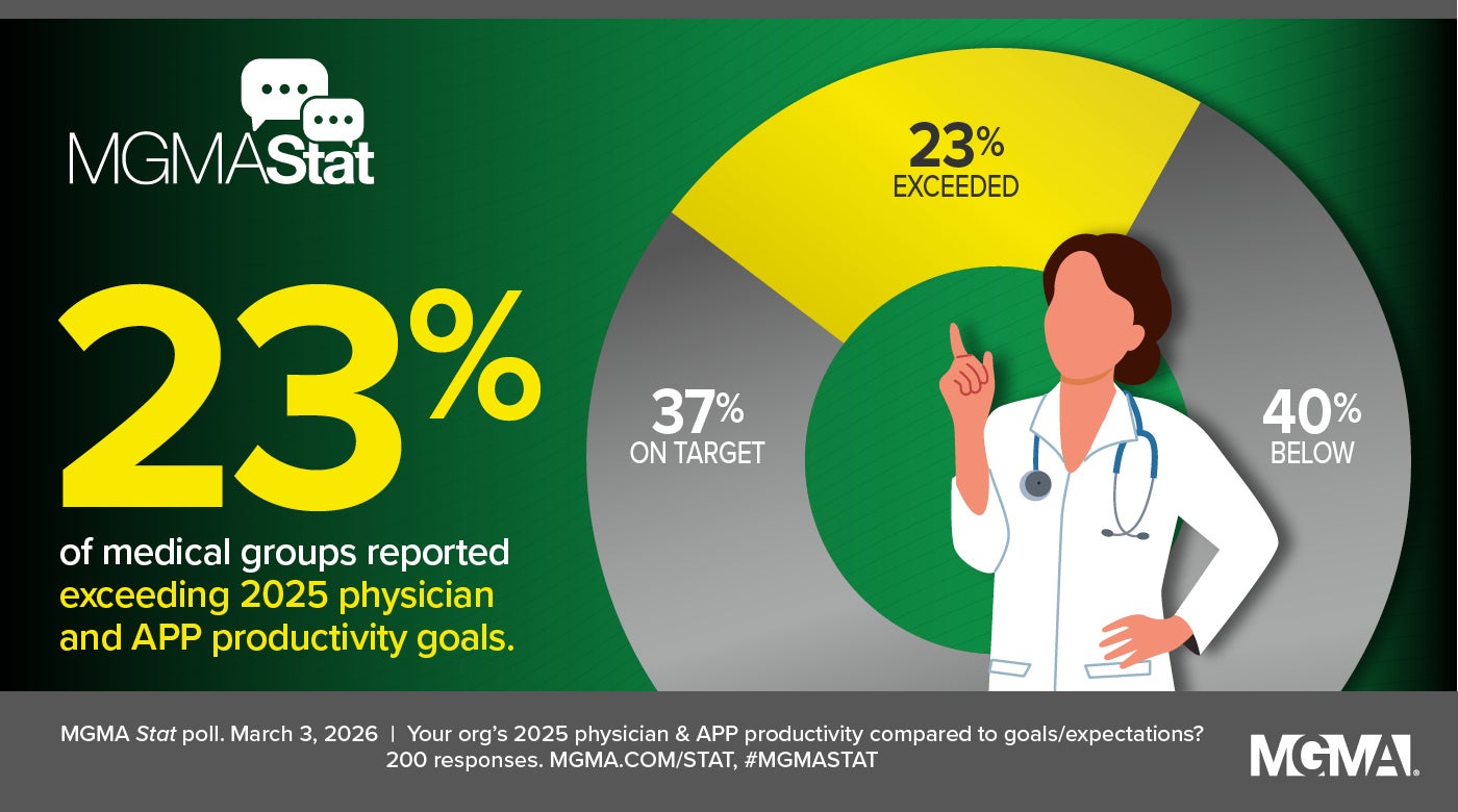 However you track it, our March 3, 2026, MGMA Stat poll gives us an early pulse on where groups landed in 2025 — and a preview, perhaps, of what may surface in late spring when the MGMA DataDive Provider Compensation launches. In this week’s poll, 60% of medical groups reported their physician and advanced practice provider (APP) productivity in 2025 was on target (37%) or exceeded (23%) goals/expectations, compared to 40% that were below. The poll had 200 applicable responses.