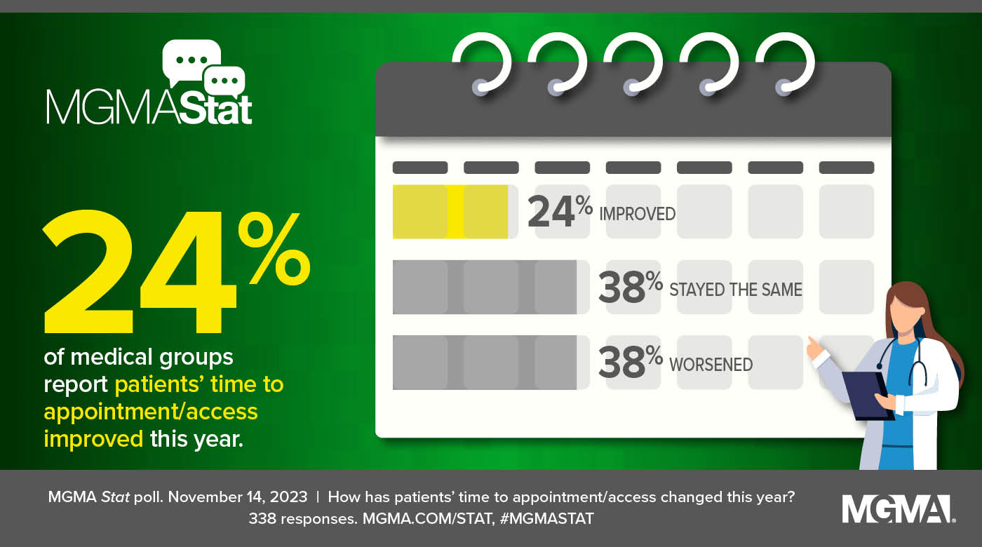 A Nov. 14, 2023, MGMA Stat poll sought to understand how time to appointments and overall patient access had changed this year, and the results paint a rough picture: Only 24% of medical group leaders report their patient access improved this year, while 38% said it stayed the same and another 38% noted that patient access had worsened in 2023. The poll had 338 applicable responses.