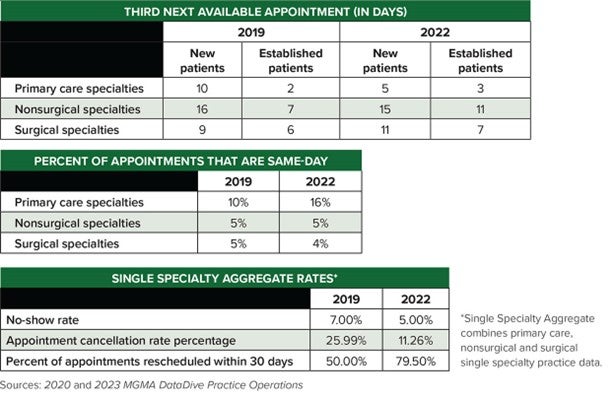 As noted in the 2023 MGMA DataDive Practice Operations data report, “Restoring Balance to Patient Access and Medical Practice Operations,” workflow improvements and innovations such as telehealth helped time to third next available appointment (TNAA) for new patients — a key patient access metric — drop by half since 2019, from 10 days to only five days in 2022.