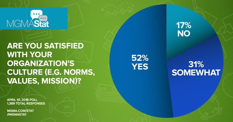 A strong organizational culture can be a catalyst for employee engagement, and help springboard your organization to success. This is borne out by a new MGMA Stat poll, as more than half of respondents expressed that their organization’s norms, values and mission met their needs.