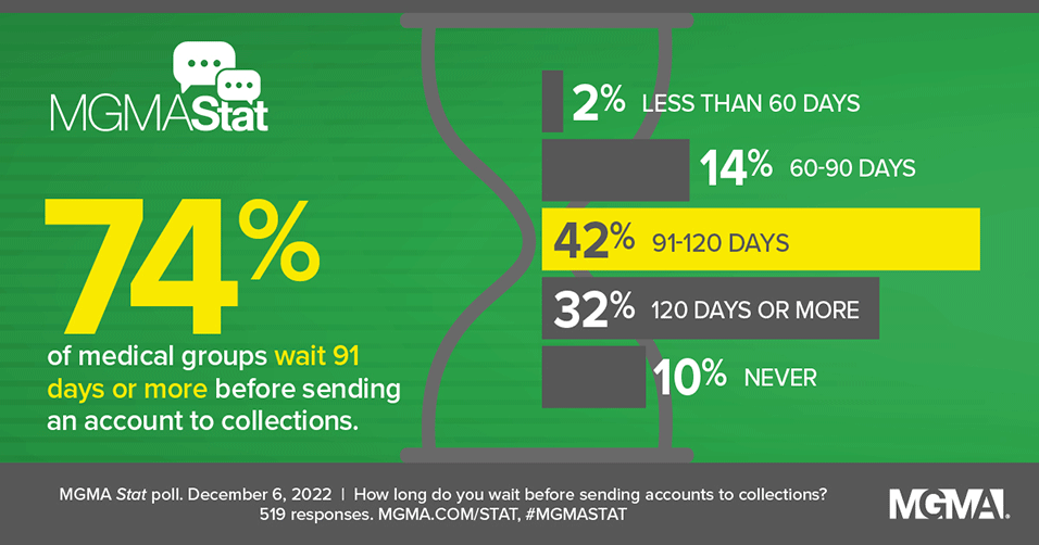 A Dec. 6, 2022, MGMA Stat poll asked medical groups how long they wait before sending a patient account to collections: