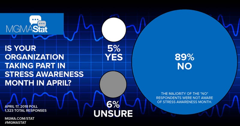 In an April 17 MGMA Stat poll, healthcare professionals were asked whether they were taking part in National Stress Awareness Month this April. Although most respondents said that their organization is not participating, 60% indicated in a follow-up response that they were not aware of stress awareness month. Overall, 5% of respondents indicated they were taking part and the remaining 6% were unsure.