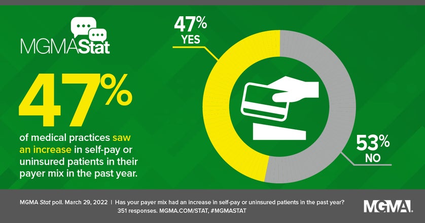 The uninsured or self-pay GFE requirements come at a time when staffing shortages are all too common for group practices. In a September 2021 MGMA Stat poll, 73% of group practices stated that staffing shortages are their greatest concern going into 2022. Without appropriate staff, these new requirements are even more challenging to effectively implement.