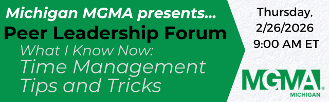 Join us for Michigan MGMA’s Peer Leadership Forum, where you can connect with board members, share challenges, and exchange ideas with fellow medical group managers on February 26, 2026 at 9:00 AM ET. This session will spotlight practical time management tips and tricks tailored for busy healthcare leaders to help you prioritize effectively, streamline workflows, and stay focused amid competing demands. It’s an open space to learn more about the chapter, gain valuable insights, and walk away with strategies you can immediately put into practice.